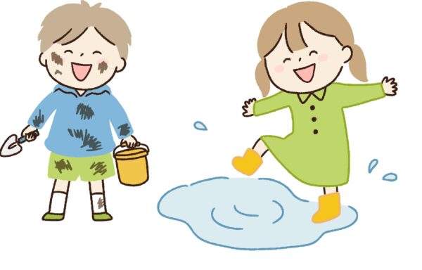そのため、水たまりに入ってちゃぷちゃぷ(踊ったり、跳ねたり)しているような様子を描いたり、泥に手を突っ込んだり、泥をかき集めたりしている様子を描いてもいいかもしれません。